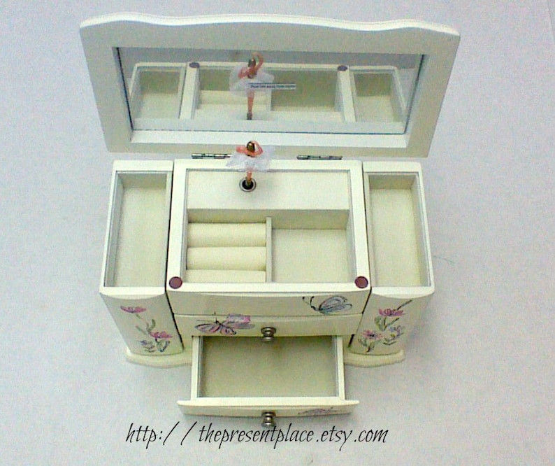 Personalized musical jewelry box. Check out our musical jewelry box selection for the very best in unique or custom, handmade pieces from our jewelry boxes shops. These beautiful hand painted jewelry boxes are musical with a dancing ballerina in a white net skirt. Boxes are personalized with name on the top.